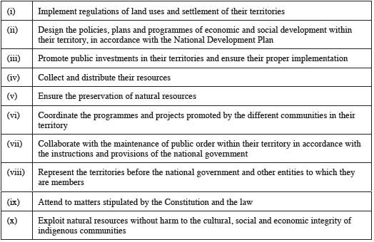 Article 330 provides the main source of connection between prior consultation and the rights of the indigenous peoples. According to the Constitution, councils formed by and regulated according to their traditions shall govern native territories. As a result, councils should exercise the following functions of this decalogue: