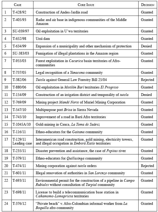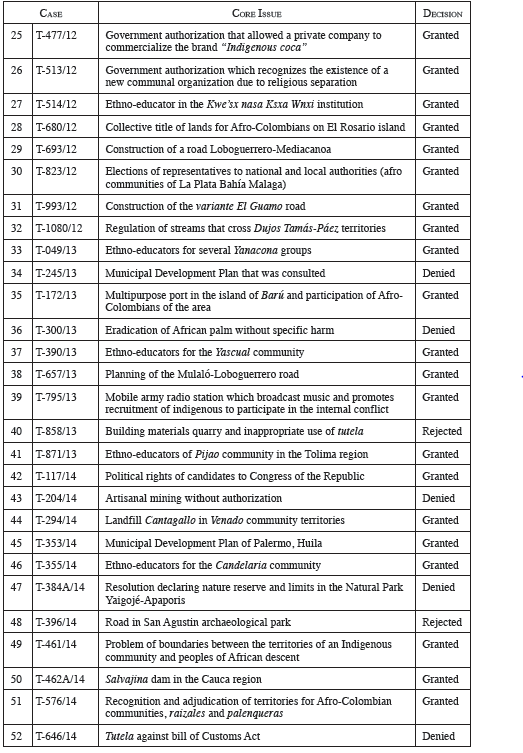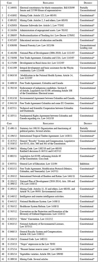 At the time of his book's publication in 2013, Bonilla had studied 23 cases. In this current study (see Tables 3 and 4 in the appendix), 82 tutela decisions and 41 regarding review of legislation, a total of 123 cases, are studied. However, the categories are still valid with the modifications that this analysis presents and clarifies on the matter. It includes SU-133/17 which confirmed and amalgamated the concrete and abstract control decisions that the CCC has developed in 25 years of case law and protection of indigenous peoples and afro-descendants right to prior and informed consultation. This case confirmed the ratio decidendi of case C-389/11 and Decision T-129/11 and the other cases that developed their principles. Additionally, the principal message behind this kind of "SU" unification judgment is to clarify or correct contradictory judgments or dicta in specific cases. 44 Also, a reason to draw an objective time limit for this research.