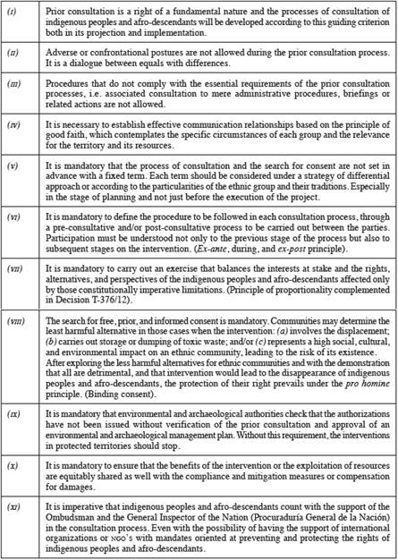 For Colombian jurisprudence, prior consultation constitutes a fundamental right. This category is entirely the elaboration of a former social right with its fundamental nature due to its multiple connections and relevance founded in the cases studied by the court.46 The standard (see Table 5 in the appendix) points out that the consultation process should be studied by the authorities using a strategy of differential approach. In accordance with the specific traditions of the groups involved; including the term of the consultation process and ingredients of each case. Apart from this, the precedent determined the relevance of an environmental license and archaeological management plan before the intervention in the protected territories.