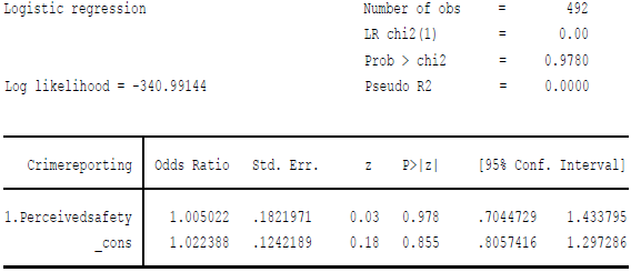The variable respect for rights during involuntary contacts with the police, which was only asked to those respondents who agreed that they had been subject of proactive police contacts, played the role of explanatory variable in hypotheses 1, 2, 3 and 4. This variable was categorical and took the values "No" and "Yes", which were labelled in the statistical model as "0" and "1", respectively. Similarly, the explanatory variable in hypotheses 5 was perceived safety in the neighbourhoods where respondents lived. The response provided a scale from 1 to 6, where 1 meant very unsafe and 6 meant very safe. Even though the explanatory variables in logistic regression can be of any type, for simplicity reasons, I coded the responses into a binary variable with the values "1, 2 and 3" for "unsafe", labelled in the model as "0", and "4, 5 and 6" for "safe", labelled in the model as "1". Finally, the explanatory variable in hypothesis 6 was perceived police effectiveness. This question was asked to all survey respondents and was labelled "0" for "poor and fair" and "1" for "good". As explained earlier, this same variable was used as response variable in hypothesis 4.