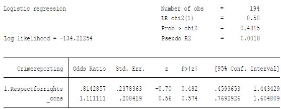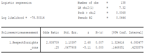 Another reasonable way of measuring police legitimacy is through citizens' evaluations of police effectiveness in controlling crime. In this way, those who believed that their rights were respected reported larger odds-1.793 times larger-of having evaluated police effectiveness in controlling crime as good than respondents who disagreed that their rights were respected (p<0.05) (Table 4). It is noteworthy that there might have been confounding variables. For example, differences explained by patrol methods. Reiner reviews an experiment done in New Jersey where foot patrols had an impact on citizens evaluating more positively police services and feeling less worried about crime111.