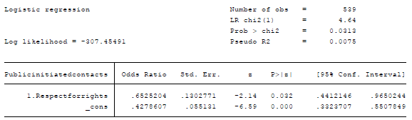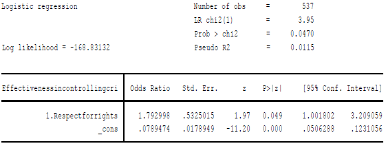 4. People who claimed that their rights were respected when experiencing involuntary contacts with the police are expected to be more likely to evaluate police effectiveness in controlling crime as good.
