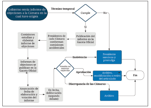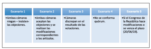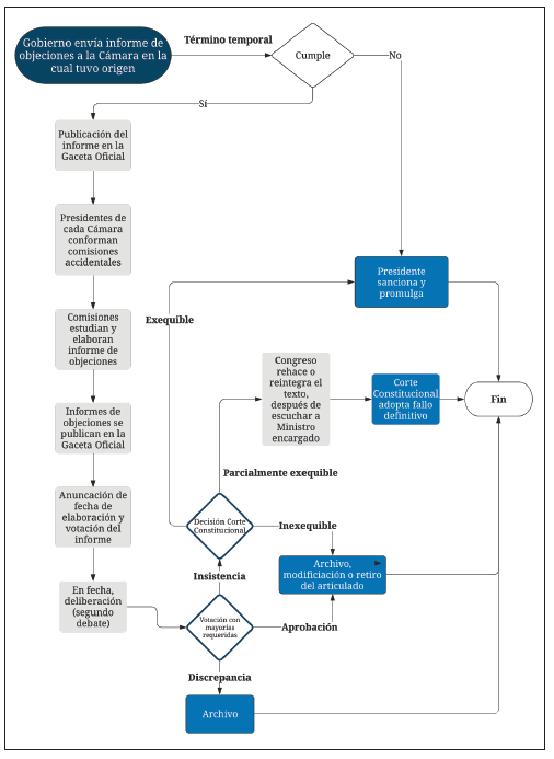 El Gobierno Nacional envía un informe de objeciones al Congreso de la República, a la cámara en la cual tuvo origen el proyecto de ley25. Dicha radicación debe estar dentro del término temporal (véase la tabla 1). Si no se encuentra dentro de dicho plazo, el presidente de la República deberá sancionar y promulgar el proyecto; por el contrario, si cumple el término, el informe de objeciones se debe26 publicar en la Gaceta Oficial para el conocimiento de ambas plenarias27. Una vez esté publicado, los presidentes28 de cada cámara conforman29 comisiones accidentales, las cuales deberán estudiar y elaborar30 un informe relativo las objeciones gubernamentales31. Escritos los respectivos informes, estos se deberán publicar en la Gaceta Oficial. Posteriormente, el Senado de la República y la Cámara de Representantes anunciarán de forma clara, determinada o determinable32 la fecha para la deliberación y votación de los informes de ponencia33. En la fecha estipulada se hará el llamado a lista34 y se surtirá la deliberación de las ponencias -como si se tratase de un segundo debate del proyecto de ley35- y se efectuará la votación de acuerdo a las mayorías requeridas36. El resultado de esta votación, puede derivar tres posibles escenarios: (a) las cámaras insisten en el proyecto de ley, por lo que el presidente de la República procederá a sancionar y promulgarlo37; (b) discrepancia en la votación de las cámaras, de manera que se archivará el proyecto38; y (c) aprobación de las objeciones, por lo que se archiva la iniciativa, se retira o se modifica la parte objetada, según lo haya solicitado el Gobierno39.