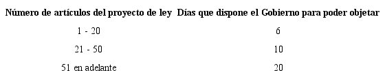 El artículo 166 de la Constitución Política y el artículo 198 de la Ley 5.a de 1992 establecen el término que dispone el Gobierno Nacional para poder objetar un proyecto de ley; esto es, de acuerdo al número de artículos que tenga el texto.
