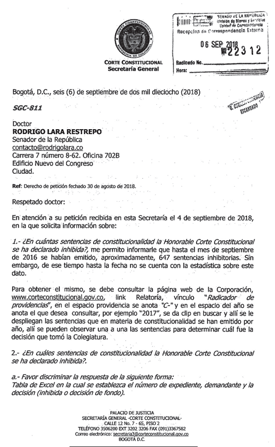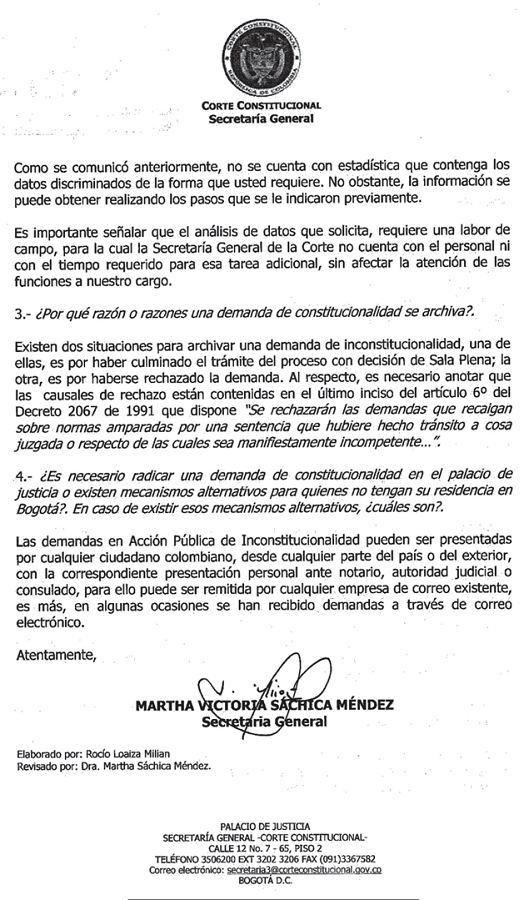 La base de datos utilizada es de autoría propia, a partir de los datos entregados por la Corte Constitucional y los expedientes consultados en línea65. Allí se especifican las fechas de la demanda, el número del expediente, el nombre de los demandantes y el resultado. De esta manera, se indica si la demanda fue archivada como consecuencia del rechazo de la demanda (tanto in limine como rechazo posterior a inadmisión y no subsanación) o una sentencia (tanto de fondo como inhibitoria).