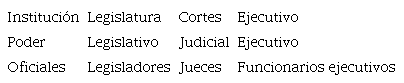 Una teoría pura exige la completa separación de los tres poderes del Estado; un estricto delineamiento entre el ejecutivo, la legislatura y las cortes. Las líneas [verticales] de nuestra tabla serían impermeables: ellas constituirían divisiones absolutas entre las instituciones, los poderes y las personas de las tres ramas. Deben existir tres instituciones diferenciadas, cada institución solo puede ejercer la facultad específicamente radicada en ella, y ningún funcionario de una institución puede servir en otra institución18.