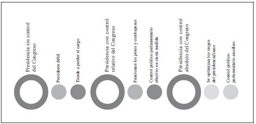Este axioma parece haberse presentado en todos los casos en los que el Presidente no controlaba el Parlamento. En todos ellos el desenlace fue, o que el Presidente fue separado del cargo por un golpe militar, o que fue vacado o tuvo que renunciar ante el acoso de la mayoría congresual. Pero también se presenta en todos los casos en los que el presidente contaba con un amplio respaldo. En estos, la ausencia de controles y contrapesos institucionales eficaces fue la regla, y tuvo como correlato, lamentablemente, hechos de corrupción y abusos de poder5.