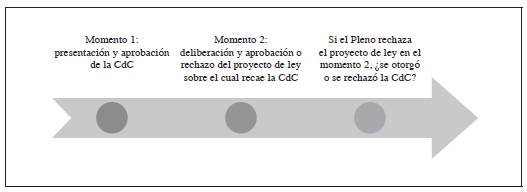 Si la cuestión de confianza se debe debatir y votar en la misma sesión en que se plantea o, a lo más, en la siguiente, ¿en qué momento se delibera sobre las ventajas o desventajas del proyecto de ley sobre el que recae? Una explicación posible es que el momento 1 incluye el momento 2, es decir, que la deliberación de la cuestión de confianza comprende, de manera directa, la deliberación del proyecto de ley; pero si eso es así, entonces ya no tendría sentido volver a debatir sobre lo mismo, esto es, ya no tendría sentido volver a debatir sobre las bondades de una iniciativa legal que, inevitablemente, tendría que ser aprobada. Otra explicación posible es que en realidad el momento 1 y el momento 2 son autónomos. Sin embargo, si esta alternativa es correcta, nada garantiza que el resultado de ambos momentos sea el mismo. Puede suceder que el Congreso otorgue su confianza al Ejecutivo en el momento 1 pero rechace posteriormente su iniciativa en el momento 2. En ese escenario, la consecuencia sería que se aprobaría la cuestión de confianza, pero no su contenido (en este caso un proyecto de ley), con lo cual, en los hechos, esta figura no podría actuar como un contrapeso adecuado del poder que, a su turno, ejerce el Congreso a través de sus mecanismos de control político.
