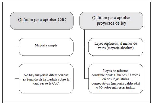 El Congreso de la República debe evaluar la inserción de mecanismos de votación cualificados para los casos en los que la confianza sea planteada para reformar alguna disposición constitucional. En el escenario actual, puede que, con una mayoría no necesariamente cualificada, el Congreso de la República termine por brindar la confianza respecto de algún proyecto de reforma constitucional, pero, una vez debatido el proyecto, se advierta que no existe la mayoría especial que exige la Constitución para una reforma de sus contenidos. En estos casos, aunque se haya brindado -a través de un acto de votación- la confianza respectiva, lo cierto es que, al menos en la práctica, no se podría materializar la propuesta planteada41.