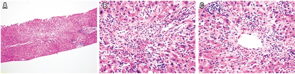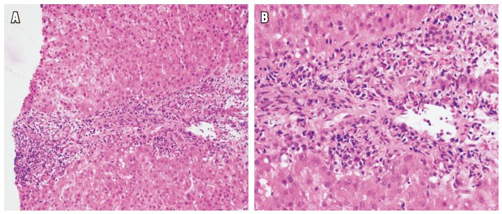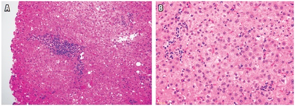Estos patrones de rechazo celular se han observado durante el primer año postrasplante. El patrón infiltrativo muestra infiltración sinusoidal prominente de linfocitos activados CD3 (+) acompañando a la clásica triada del rechazo. En el patrón hepatítico se sobreponen las características típicas del rechazo agudo celular, acompañados de necroinflamación del parénquima o focos de necrosis confluente, sin una preferencia en su localización (Figura 10). Clínicamente, muestra más compromiso sistémico, elevación de AST y buena respuesta al tratamiento, pero tienen un potencial mayor hacia la cronicidad. No están incluidos en la puntuación de Banff, por lo que se recomienda realizar el puntaje RAI, indicando la presencia de estos patrones, lo cual requerirá un seguimiento más estrecho para evitar la progresión a rechazo crónico. El diagnóstico diferencial más importante es la presencia de infecciones virales (29).