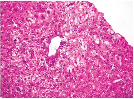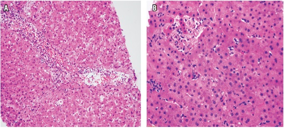 En el examen anatomopatológico, en las fases más iniciales, los cambios son inespecíficos, semejan lo observado en la lesión de preservación con balonización de hepatocitos y necrosis hepatocitaria en zona 3. El endotelio es la célula directamente lesionada; por lo tanto, el daño microvascular que se produce en las primeras horas lleva a hemorragia focal con agregados sinusoidales de células inflamatorias de tipo polimorfonucleares neutrófilos y plaquetas, con trombosis de vasos pequeños. Progresa a edema portal y periportal con reacción ductular o proliferación colangiolar, lo que semeja obstrucción de la vía biliar, con hipertrofia de células endoteliales que compromete vasos venosos portales y capilares, acompañado de linfocitos y eosinófilos adheridos al endotelio (Figura 3).