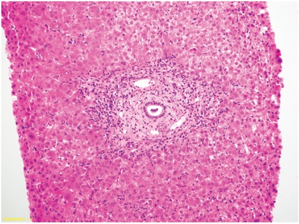 Lesión ductal: ductulitis de linfocitos y cambios degenerativos ductales