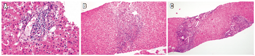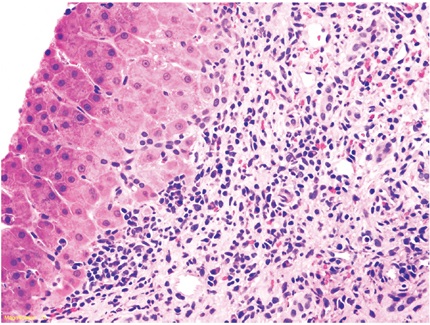 - Inflamación portal: cualquier grado de inflamación portal con presencia de una población heterogénea de células inflamatorias, tales como linfocitos T activados, inmunoblastos y eosinófilos, acompañados de algunos plasmocitos y polimorfonucleares neutrófilos. Puede existir leve o mínima inflamación lobulillar, en parches (Figura 5)