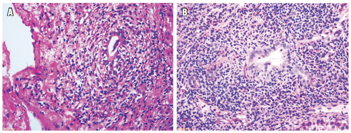 - Lesión inflamatoria de la vía biliar: ductulitis o presencia de células inflamatorias linfoides en el epitelio de ductos pequeños (<30 µm) y cambios degenerativos dados por aumento de la relación núcleo/citoplasma, hipercromasia y pleomorfismo nuclear, seudoestratificación nuclear o alteración de la polaridad, mitosis, vacuolización paranuclear del epitelio ductal; puede existir ruptura de la membrana basal (Figura 6).