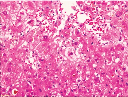 Histológicamente, se caracteriza por edema celular o balonización, necrosis aislada con formación de cuerpos acidofílicos o necrosis masiva acompañada de agregados de neutrófilos y colestasis hepatocanalicular de localización perivenular (zona 3), dada la mayor susceptibilidad de esta región a los eventos isquémicos, los cambios se hacen evidentes en las primeras 48 horas después del trasplante (Figuras 1 y 2). Cuando se toman biopsias en tiempo cero (0), o posreperfusión, son más prominentes los agregados de células inflamatorias polimorfonucleares neutrófilos. En casos severos, disminuye la inflamación y aumenta la necrosis, lo que compromete todo el ácino (panacinar) (13).