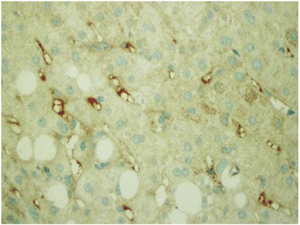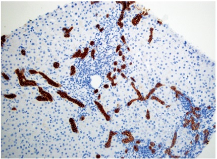 En casos severos puede existir trombosis de las ramas intrahepáticas de la vena portal, con infartos venosos y cambios extensos de tipo isquémico y formación de infartos geográficos; puede haber compromiso de venas y arterias hepáticas o de la vena cava inferior. Para este diagnóstico es indispensable asegurarse de excluir trombosis de la arteria hepática o la obstrucción biliar. Reactividad para C4d por inmunohistoquímica (en tejido incluido en parafina) es difícil de interpretar aisladamente; tiene varios patrones, debe ser intensa en al menos el 50% de las venas portales, en capilares del estroma portal o con distribución sinusoidal (Figura 4). Si existe disponibilidad de tejido en fresco o congelado, el método considerado más confiable son estudios de inmunofluorescencia con reactividad sinusoidal para C4d. También se ha demostrado reactividad linear para IGG o IGM, fracciones del complemento C3, C4, C1q, fibrinógeno en la pared de los vasos arteriales y presencia de anticuerpos anti HLA (17,20,21,22,23,24). Es importante enfatizar que se ha descrito presencia focal de C4d en una gran cantidad de aloinjertos, sin evidencia de rechazo humoral mediado por anticuerpos. Por lo tanto, el diagnóstico preciso de rechazo humoral puede ser útil para determinar e indicar la posibilidad del uso de plasmaféresis en el postoperatorio inmediato o mediato, y para evaluar en los protocolos actuales la posibilidad de trasplante ABO incompatible (24).