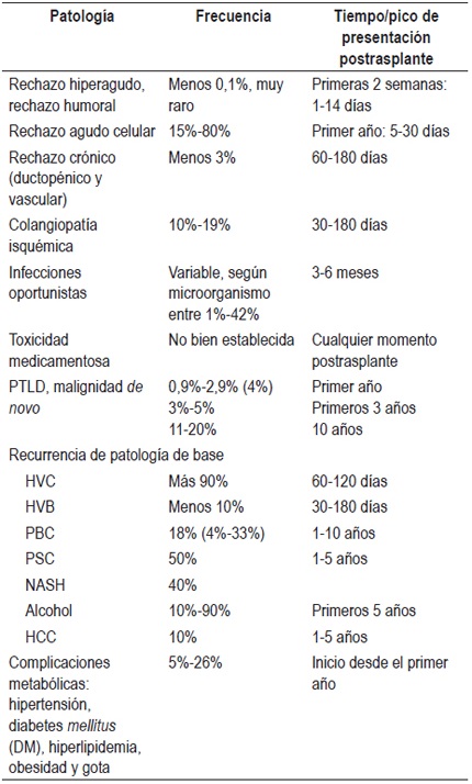 Tradicionalmente la patología del postrasplante hepático se ha dividido según su tiempo de aparición sea temprana o tardía; algunas de estas se resumen en la Tabla 1. Las preguntas que nos hacemos con más frecuencia dependen del tiempo en el cual ocurre el evento al cual nos enfrentamos. Si durante la primera semana postrasplante hay empeoramiento de la función hepática, o no se normalizan las pruebas, estamos ante una disfunción primaria o secundaria del injerto y deben ser considerados: la lesión de preservación/reperfusión, problemas inmunológicos como rechazo agudo celular, incompatibilidad ABO o rechazo mediado por anticuerpos; factores que dependen del donante o de los problemas técnicos, en especial vasculares por falla en la anastomosis o trombosis.