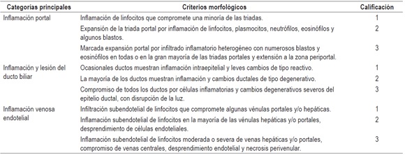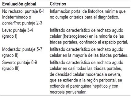 La calificación del sistema Banff asigna un peso numérico a cada uno de los criterios o parámetros morfológicos, según su severidad, valorando un índice de actividad bien conocido como RAI score para el rechazo agudo celular, asigna una puntuación de 1 a 3 con máximo posible de 9. En la Tabla 2 se indica una aproximación a la evaluación patológica utilizando un índice semicuantitativo; en la Tabla 3, la graduación y terminología utilizada según recomendación del consenso de Banff. La aplicación del esquema de Banff presupone que el diagnóstico histológico ya se ha establecido (16,26). La triada clásica incluye inflamación portal, lesión de ductos biliares portales y lesión inflamatoria vascular. Es necesario tener al menos dos de estas tres características; la presencia de inflamación portal es indispensable para el diagnóstico histopatológico de rechazo agudo (16). Los criterios histopatológicos que debemos tener en cuenta se evalúan en densidad de la inflamación y en porcentaje de compromiso de los espacios portales representados en la biopsia, o de las estructuras ductales o vasculares comprometidas.