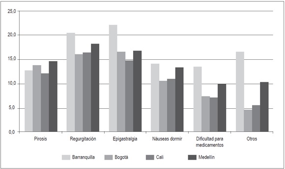 La prevalencia general de síntomas de reflujo para la población, de acuerdo con el cuestionario GERDQ, fue la siguiente: pirosis, 13,6% (IC 95%: 12,50-14,60); regurgitación, 16,9% (IC 95%: 15,74-17,99); epigastralgia, 16,67 (IC 95%: 15,54-17,80); náuseas, 11,4% (IC 95%: 10,46-12,35); dificultad para dormir por presentar pirosis o regurgitación, 8,17% (IC 95%: 7,36-8,97); y consumo de medicamentos adicionales a los formulados por el médico, 6,68% (IC 95%: 6,01-7,35). La prevalencia de síntomas de reflujo por ciudades se presenta en la figura 1, donde se observa que a excepción de la pirosis, que se presentó con mayor frecuencia en Medellín (14,6%; IC 95%: 12,93-16,29), los otros síntomas fueron más frecuentes en Barranquilla.