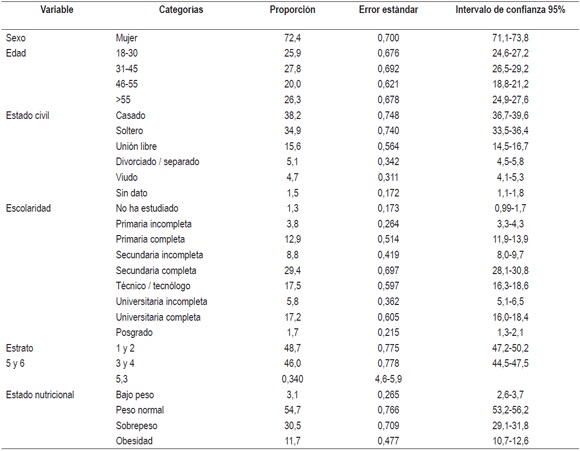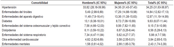Respecto a las características de los sujetos incluidos en el estudio (tabla 1): el promedio de edad fue de 44,07 años (IC 95%: 43,58-44,56); la mayoría eran mujeres; el nivel de escolaridad más frecuentemente encontrado fue el de secundaria completa; el estado civil más reportado fue casado; y la mayoría de la población vivía en estratos 2 y 3. En cuanto al estado nutricional, se observó que la mayoría de la población tenía peso normal, aunque un importante porcentaje presentó sobrepeso 30,5 (IC 95%: 29,1-31,8). El 9,5% (IC 95%: 8,6-10,4) de los encuestados consumía cigarrillo. El 15,8% (IC 95%: 14,7-16,9) refirió haber consumido licor en la última semana antes de la encuesta y el 27,1% (IC 95%: 25,8-28,5) presentó una comorbilidad, siendo la hipertensión, la diabetes y las enfermedades en el aparato digestivo las más frecuentes en hombres, mientras que en mujeres, las tres comorbilidades más informadas, en orden descendente, fueron la hipertensión, las patologías tiroideas (hipertiroidismo o hipotiroidismo) y las enfermedades en aparato digestivo (tabla 2).