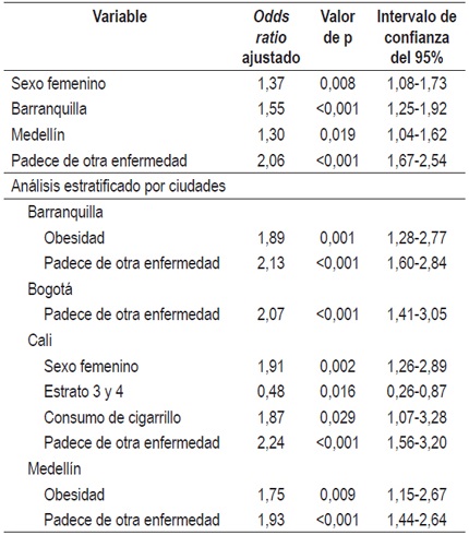 En el análisis multivariado se observó que los factores estadísticamente asociados con la presencia de reflujo para la población en general fueron: ser mujer, vivir en Barranquilla o Medellín (comparado con Bogotá) y tener una comorbilidad. Cuando se hizo este mismo análisis estratificado por ciudades, se observó que además de la comorbilidad, que es un factor de riesgo para tener reflujo en todas las ciudades, en Barranquilla y Medellín las personas con obesidad presentaron un riesgo mayor de tener enfermedad por reflujo comparadas con aquellas con peso normal (OR: 1,89; IC 95%: 1,28-2,77; y OR: 1,75; IC 95%: 1,15-2,67; respectivamente). En Cali, las mujeres presentaron más riesgo que los hombres (OR: 1,91; IC 95%: 1,26-2,89), así como los fumadores comparados con los no fumadores (OR: 1,87; IC 95%: 1,07-3,28). Además se encontró que vivir en estratos 3 y 4 es un factor protector comparado con vivir en estratos 5 y 6 (OR: 0,48; IC 95%: 0,26-0,87) (tabla 3).