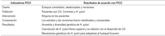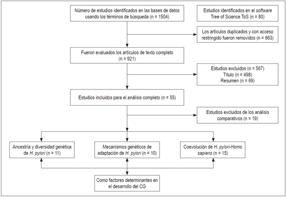 Inclusión: estudios de poblaciones humanas, en inglés y español, ensayos controlados, aleatorizados y revisiones de: (I) ancestría y diversidad genética de H. pylori; (II) coevolución de H. pylori-Homo sapiens; (III) mecanismos genéticos de adaptación de H. pylori al huésped, como factores determinantes en el desarrollo de CG.