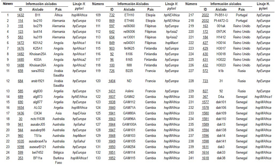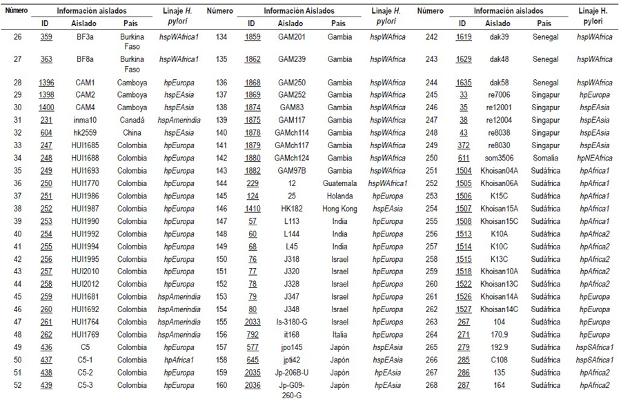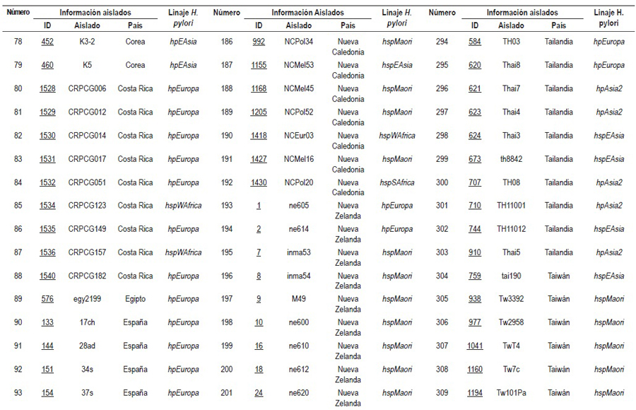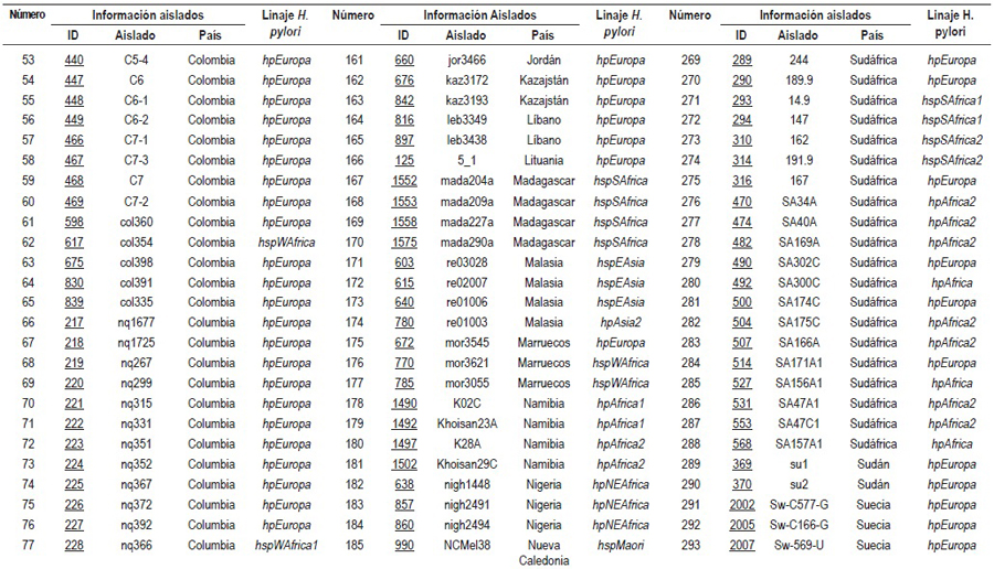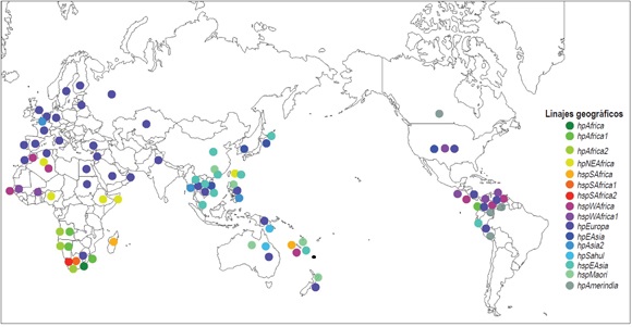 El 61,5% de los estudios analizó la diversidad genética mediante la tipificación de las secuencias multilocus sequence typing (MLST) de 7 genes conservados (atpA, efp, mutY, ppa, trpC, ureI, y yphC) y de genes asociados con la virulencia en diferentes grupos étnicos (vacA, cagA, hspA y oipA). A partir del análisis de los MLST en programas como STRUCTURE, el H. pylori fue subdividido en 7 poblaciones específicas para grandes áreas geográficas: hpEuropa, hpNEAfrica, hpAfrica1, hpAfrica2, hpAsia2, hpSahul y hpEastAsia con las subpoblaciones hspEAsia, hspMaori y hspAmerindia (3, 4, 6-9, 11-13, 16, 18, 33, 35, 37), las cuales derivan de 6 poblaciones ancestrales: Europa1 ancestral (AE1), Europa2 ancestral (AE2), Asia Oriental ancestral, África1 ancestral, África2 ancestral y Sahul ancestral (6).