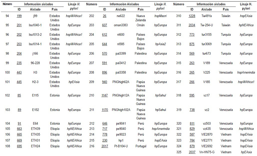 Las secuencias (MLST) de 7 genes constitutivos (atpA, efp, mutY, PPA, trpC, ureI y yphC), correspondientes a 325 aislados de H. pylori (anexo 1), reportados en la base de datos de PubMLST ( http://pubmlst.org/ ), fueron empleadas para realizar el mapa de distribución de las cepas de H. pylori en el programa INKSCAPE ( https://inkscape.org/es/ ). Los aislados fueron seleccionados de tal forma que incluyeran los siete continentes.