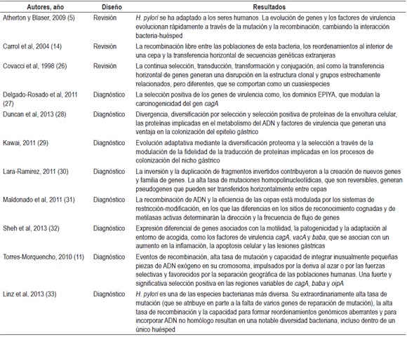 De los estudios, 8 (30,7%) coinciden en que la diversidad de la bacteria tiende a disminuir al aumentar la distancia desde África, en consonancia con lo observado en las poblaciones humanas, y que la inusual flexibilidad genética intrapoblacional está dada por eventos de recombinación, una alta tasa de mutación y la inserción de fragmentos de ADN exógeno en el cromosoma bacteriano, que generan cambios genómicos y permiten la evolución de zonas de plasticidad y mecanismos de regulación que modulan la expresión génica (4, 6, 7, 11, 16, 33).