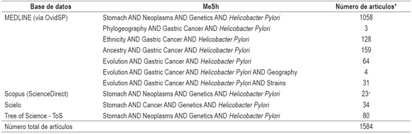 Se incorporaron: la declaración PRISMA (http://www.prisma-statement.org/), las bases de datos MEDLINE (OvidSP), Scopus (ScienceDirect), Scielo y el software Tree of Science – ToS (www.mytreeofscience.com) y los términos de búsqueda “stomach”, “cancer”, “neoplasms”, “ethinicity”, “evolution”, “genetics”, “ancestry” y “Helicobacter pylori” (tabla 1). EL DOI de los artículos se verificó en http://www.doi.org/.
