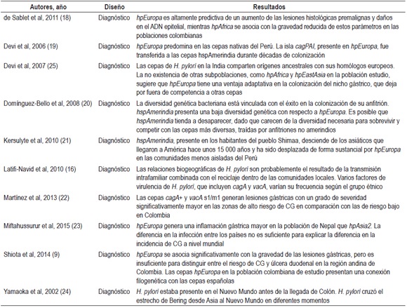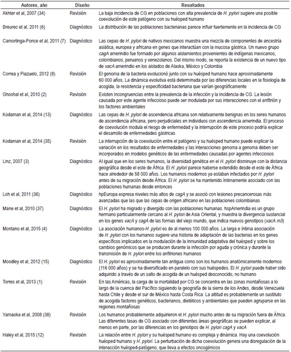Para el análisis comparativo fueron seleccionados 36 estudios, de los cuales 11 (30,55%) relacionan aspectos de ancestría y diversidad genética huésped-hospedero con el desarrollo de lesiones gástricas (9, 16, 18, 19 - 24, 25) (tabla 3); 10 (27,77%) reportan mecanismos de adaptación de la bacteria (5, 11, 14, 26 - 30, 31, 32, 33) (tabla 4); finalmente, 15 (41,66%) relacionan aspectos coevolutivos de H. pylori-Homo sapiens como factores determinantes en el desarrollo del CG (1-4, 6-8, 12, 13, 15, 34-38) (tabla 5). El 78% de los estudios corresponde a publicaciones en revistas estadounidenses y del Reino Unido y un 69,44% fue publicado entre el 2010 y el 2015. Los estudios de diagnóstico corresponden al 69,44% y las revisiones, al 30,56%.