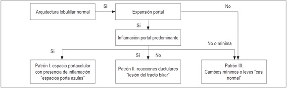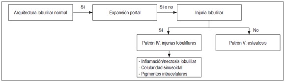 En la figura 5 se muestra un algoritmo con arquitectura lobulillar normal y expansión portal. Se debe buscar la presencia de injuria lobulillar o esteatosis.
