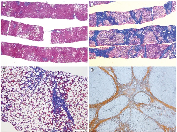 La fibrosis pericelular o subsinusoidal se observa característicamente en la zona 3 en la esteatohepatitis no alcohólica y alcohólica; en esta última puede progresar, ocluyendo la vena central. También se presenta en enfermedades que causan obstrucción al flujo venoso en forma crónica, como la enfermedad venooclusiva sinusoidal y el síndrome de Budd Chiari; en enfermedades metabólicas, como la enfermedad de Wilson, tirosinemia, galactosemia, entre otras; y en enfermedades infecciosas, como leishmaniosis o sífilis congénita. La fibrosis centrada en el espacio porta ocurre en la enfermedad hepática crónica de cualquier etiología, especialmente hepatitis virales B, C y autoinmune. Inicia en forma irregular en el espacio porta, con extensión periportal, posteriormente desarrolla tabiques porta-porta y, finalmente, portacentrales, hasta conformar nódulos cirróticos regenerativos. El término de cirrosis incompleta o temprana se utiliza cuando la nodularidad no es completa (29).