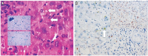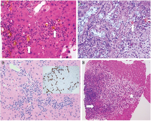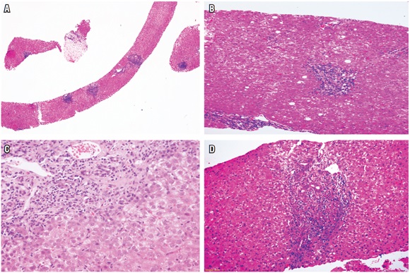Uno de los hallazgos más frecuentes en la patología hepática, es la presencia de infiltrados inflamatorios portales, estos se observan en una amplia variedad de enfermedades hepáticas que incluyen, principalmente, enfermedades necroinflamatorias, como las hepatitis virales, hepatitis autoinmune y las inducidas por medicamentos, también en enfermedades colestásicas crónicas, como colangitis biliar primaria o la colangitis esclerosante primaria, enfermedades metabólicas de tipo enfermedad de Wilson, deficiencia de α 1 antitripsina o condiciones neoplásicas, como infiltración por linfoma, leucemias o síndrome linfoproliferativo postrasplante (figura 2A).