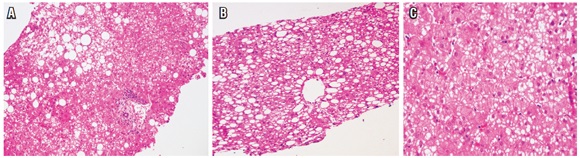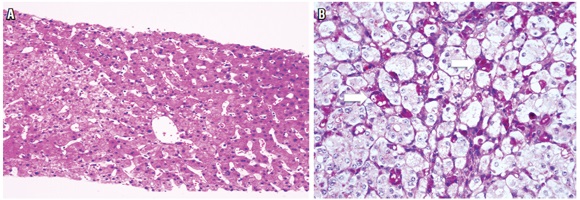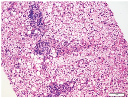 Usualmente no es indicación de biopsia. En raras ocasiones se indica, por ejemplo cuando existe duda o error en el diagnóstico clínico, o cuando, a pesar de estar bien establecido el diagnóstico, el clínico necesita información más certera del estadio o gravedad de la enfermedad, y por último, en el postrasplante. Muestra prominente inflamación lobulillar, inflamación portal linfocitaria leve, edema o balonización hepatocelular, necrosis o apoptosis aislada, dispersa en el lobulillo, cuerpos acidofílicos, acúmulos de macrófagos con material PAS diastasa positivo y colestasis hepatocanalicular, en casos moderados y graves (figura 6).