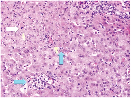Ocurre en pacientes inmunosuprimidos. Se presenta con inflamación portal y lobulillar con linfocitos y neutrófilos, microabscesos de polimorfonucleares neutrófilos localizados en el lobulillo, inclusiones virales de CMV y no hay distribución zonal.