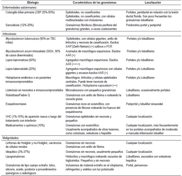 Los granulomas, pueden localizarse a nivel portal, en el parénquima o ambos. La localización y las características de los granulomas pueden orientar el diagnóstico. En la tabla 1 se resumen algunas de estas características.