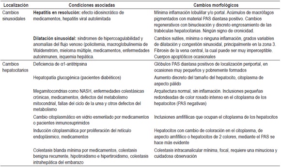 En cerca de 5% de las biopsias se encuentra cambios inespecíficos, infiltrados inflamatorios mínimos portales o lobulillares, o están ausentes, no hay evidencia de fibrosis ni cambios estructurales. En 80% de estos pacientes, existe anomalías persistentes en las pruebas de función hepática y en 20% ascitis inexplicada, que obliga a realizar una biopsia.