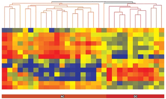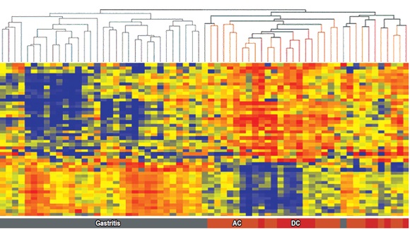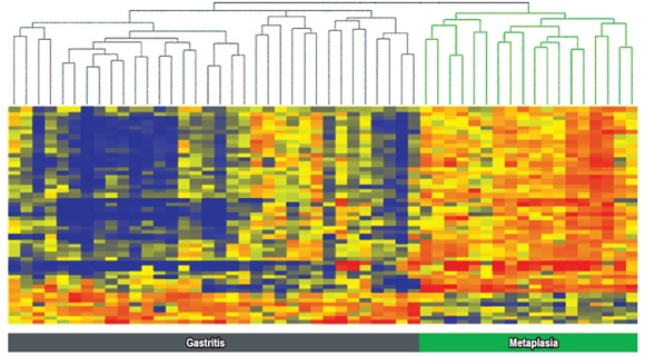Para diferenciar a los pacientes con gastritis crónica de pacientes con metaplasia intestinal se encontró un perfil de expresión de 48 genes distintos. Al comparar este grupo de genes con el diagnóstico patológico, la exactitud de la agrupación jerárquica de estos genes fue del 100%, sin falsos positivos o falsos negativos (figura 8) (15).