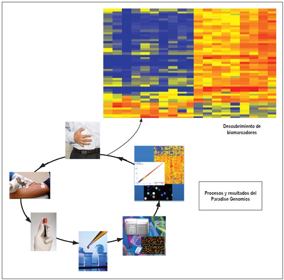 Por tanto, la información que puedan dar nuevos biomarcadores que permitan estratificar el riesgo de cáncer gástrico es muy importante para aplicaciones a gran escala, sobre todo en poblaciones con alto riesgo de la enfermedad, como Colombia. La intención de este trabajo es la búsqueda de estos biomarcadores y, para conocimiento de los autores, es el primero en Colombia, población de alto riesgo, que permite identifica un perfil de expresión genética en sangre, el cual diferencia claramente pacientes con gastritis de pacientes con cáncer gástrico. La identificación de estos 49 genes permitirá en un futuro diseñar una prueba que diagnostique si un paciente tiene o no cáncer gástrico (figura 1). Además, se logró identificar otro perfil de expresión génica con 14 genes que discrimina si el tumor es difuso o es adenocarcinoma intestinal.
