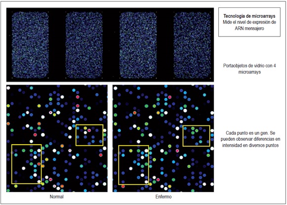 La calidad y cantidad del ARN complementario resultante (ARNc) también se evaluó mediante espectrofotometría y el equipo Agilent Bioanalyzer antes de la hibridación. El ARNc se hibridó con sondas de ADN en SurePrint G3 Human Gene Expression 8x60K v2 Microarrays de Agilent Technologies. El estudio se realizó con la última versión de microarrays de todo el genoma humano, la cual se dirige a 50 599 características biológicas diferentes (29). Después de la hibridación, las matrices se lavaron y se escanearon en alta resolución en el escáner Agilent Microarray SureScan con rango dinámico ampliado (figura 4).