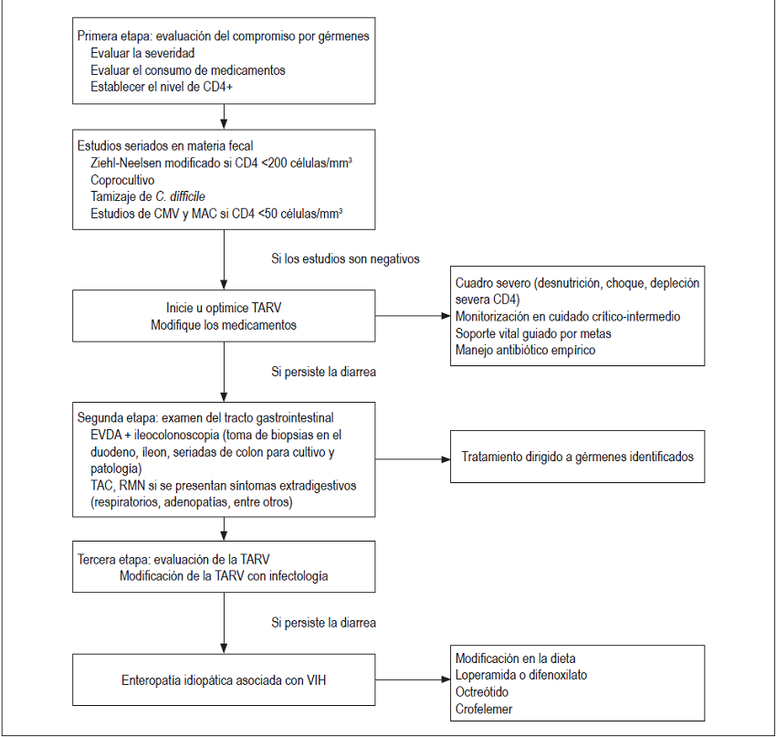 Se ha descrito diarrea asociada con la TARV hasta en un 2% a 19% de los pacientes 49. Si se considera que hay relación entre un medicamento de la TARV y la diarrea, esta tercera etapa puede preceder a la segunda. Siempre se debe tener un concepto del infectólogo antes de considerar suspender o cambiar medicamentos de la TARV (Figura 2 ).