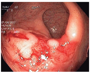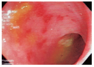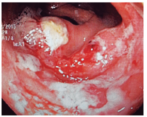 Varios estudios han demostrado la utilidad de los procedimientos endoscópicos en este contexto. Se debe aclarar que no hay un patrón endoscópico típico de infección por oportunistas, por tanto, siempre se deben tomar biopsias. Se sugiere que la infección por Salmonella predomina en el colon derecho y va desde un eritema hasta ulceraciones. La infección por amebas suele afectar el ciego y rectosigmoide, con ulceraciones y zonas de necrosis (Figura 4 ). El CMV puede generar ulceraciones que predominan en el colon izquierdo (Figura 5 ). El rendimiento de la colonoscopia va desde el 27% al 39%, y el CMV es el germen más común 38.
