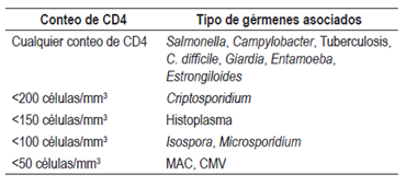 Es importante tener en cuenta que hasta en un 50% de pacientes con infección por VIH y diarrea no se logra el aislamiento de gérmenes patógenos. De todas maneras, siempre se deben realizar estudios en búsqueda de agentes microbiológicos debido a que el pronóstico y desenlace del paciente se modifica de manera importante en caso de lograr un diagnóstico puntual. Es una amplia lista la que se ha descrito de potenciales gérmenes asociados con diarrea en VIH. A continuación, se revisan brevemente los más relevantes en nuestro medio.