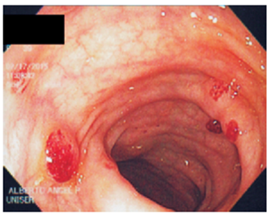La afectación colorrectal usualmente se da en pacientes hacia la cuarta o quinta década de la vida, como el caso reportado, y es el dolor abdominal pobremente localizado uno de sus síntomas más comunes, que puede estar acompañado por cambios en las deposiciones y, en ocasiones, por hemorragia. Al examen físico, el hallazgo más frecuente es la masa palpable, entre el 30 % y el 88 % de los casos. En cuanto a los hallazgos en el estudio endoscópico, se puede evidenciar engrosamiento difuso, que, en principio, puede confundirse con un adenocarcinoma 4,5,6,7,8.