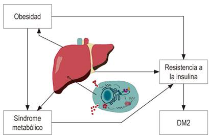 La progresión de la fibrosis hepática es responsable del desarrollo de resistencia a la insulina y DM2; sin embargo, la DM también puede ocurrir en etapas tempranas de la enfermedad hepática 19,20. Inicialmente, se consideraba el daño a largo plazo del hepatocito, como causa de las alteraciones en la homeostasis de la glucosa, pero diferentes estudios han evidenciado que los pacientes con otras patologías hepáticas crónicas como la infección por virus de la hepatitis B (VHB) tienen baja prevalencia de DM, en comparación con pacientes con hepatitis C crónica 21-24.
