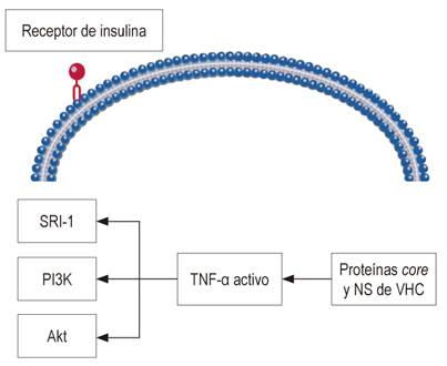 La principal característica de los pacientes diabéticos es la resistencia a la insulina, la cual es crucial para la progresión de la fibrosis y su impacto negativo en la respuesta al tratamiento con antivirales en sujetos con VHC crónica 76. La reducida sensibilidad a la insulina es la base de la hiperinsulinemia compensatoria y los niveles elevados de factor de crecimiento similar a la insulina tipo 1 (IGF-1), el cual estimula la proliferación celular e inhibe la apoptosis. Este fenómeno tiene fuertes efectos mitogénicos en una amplia variedad de líneas celulares cancerígenas 77. Al mismo tiempo, la insulina activa el receptor de IGF-1, que tiene un efecto promotor de crecimiento que incluye la modulación de la progresión del ciclo celular. El exceso de insulina puede llevar indirectamente al desarrollo de cáncer por la regulación del nivel de proteína 1 ligada a IGF, lo que incrementa el nivel y biodisponibilidad de IGF-1 circulante. La obesidad e inactividad física también causan hiperinsulinemia y por esto también se asocia con progresión acelerada de cáncer 78.