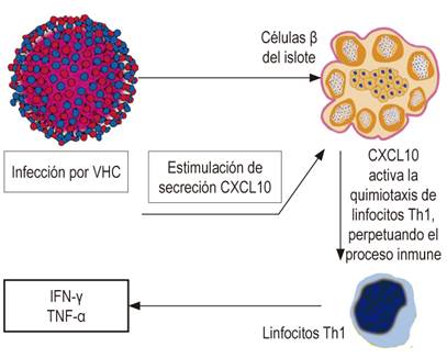 Distintos mecanismos se han postulado. Así como el VHC puede infectar tejidos extrahepáticos, la participación de este en el inicio de DM1 aún no se ha aclarado 64. Más allá de los mecanismos directos no demostrados, la infección por VHC inicia o acelera una reacción inmunitaria contra las células β. La infección de células β por VHC puede regular la expresión y secreción del gen CXCL10 y reclutamiento de linfocitos Th1, que secretan IFN-γ y TNF-α, los cuales inducen la secreción de CXCL10 por células β y de este modo perpetúan la cascada inmunitaria; dicha cascada puede llevar a disfunción de células β en sujetos predispuestos genéticamente (Figura 3) 65. Adicionalmente, se sugiere el mimetismo molecular con un desencadenante de autoinmunidad relacionada con el VHC, la descarboxilasa del ácido glutámico (GAD) comparte una secuencia de 65 aminoácidos similar con regiones antigénicas de la poliproteína del virus 66. Otra posibilidad es la inducción de anticuerpos reactivos contra GAD y el desarrollo de DM mediada por interleucina 18 (IL-18) y otras citocinas proinflamatorias 67. La IL-18 juega un papel patogénico en DM1 porque está involucrada en la aceleración del desarrollo de la enfermedad manifiesta, puede inducir respuesta Th1 y Th2 dependiendo de las citocinas circundantes, además de jugar un rol patogénico en distintas enfermedades incluida la insuficiencia hepática aguda 67,68. Otras citocinas proinflamatorias, tales como, TNF-α e IL-1B, que están elevadas en pacientes con hepatitis aguda, pueden también inducir diabetes autoinmune 69.