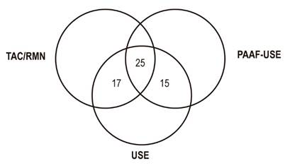 Para establecer la concordancia entre las conclusiones de las imágenes, la USE y el reporte de la muestra tomada por PAAF-USE, se utilizó la aproximación de concordancia por consistencia, en la cual no se asume que alguna de las pruebas es el estándar de referencia 14. Este enfoque permite evaluar si los resultados de las diferentes pruebas son equivalentes entre ellas, pero no asume que los resultados de una u otra sean correctos. Por tanto, no permite determinar si alguna de las pruebas es mejor.