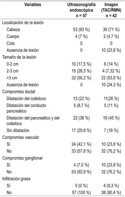 De acuerdo con los hallazgos reportados en la USE, la mayoría de las lesiones tenían un tamaño >3 cm (59 %), con una mayor frecuencia de localización en la cabeza del páncreas (93 %). Un porcentaje significativo de los pacientes tuvieron un compromiso del colédoco y del conducto pancreático de forma simultánea, tanto en la USE como en la imagen radiológica (38 y 45 %, respectivamente).